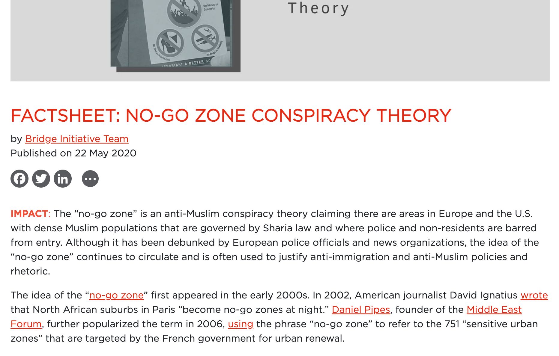 FAKTO: NE-IRI ZONA KONSPIRA TEORIO de Bridge Initiative Team Publikigite la 22-an de majo 2020 EFIKO: La "Ne-Iri-Zono" estas kontraŭ-islama konspira teorio, kiu asertas, ke ekzistas areoj en Eŭropo kaj Usono kun altaj islamaj loĝantaroj, kie Sharia leĝo validas kaj polico kaj ne-loĝantoj estas malpermesitaj eniri. Kvankam ĝi estis malkonfirmita de eŭropaj policaj oficistoj kaj novaĵorganizoj, la ideo de la "neirebla zono" daŭre cirkulas kaj ofte estas uzata por pravigi kontraŭ-enmigrintajn kaj kontraŭ-islamajn politikojn kaj retorikon. La ideo de la "neirebla zono" unue aperis en la fruaj 2000-aj jaroj. En 2002, amerika ĵurnalisto David Ignatius skribis ke nordafrikaj antaŭurboj en Parizo "fariĝas neireblaj zonoj nokte." Daniel Pipes, fondinto de la Proksima Orienta Forumo, plue popularigis la esprimon en 2006 uzante la frazon "ne-irzono" por priskribi la 751 "sentemajn urbaj zonojn" selektitajn fare de la franca registaro por urba renovigo.