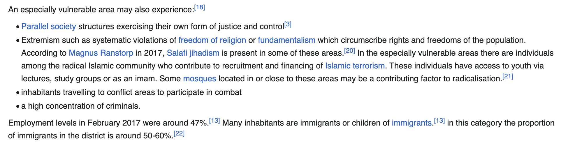 Kial eŭropaj nacioj ne povas trovi solvojn? Kial ili ne povas konfesi, ke ekzistas areoj en kiuj estas danĝera eniri se vi ne estas de islama kredo? Se grandurbo aŭ lando formale nomus tiajn areojn kiel ekskludzonojn, ĝi esence devus koncedi la fiaskon de la ŝtato. Do dum tiuj, kiuj parolas pri la danĝeroj de ekskludaj zonoj, estas etikeditaj "dekstraj", la vero estas, ke tiuj, kiuj loĝas proksime aŭ en ĉi tiuj zonoj, bone scias pri sia ekzisto. La sekva citaĵo estas el el Vikipedio:
